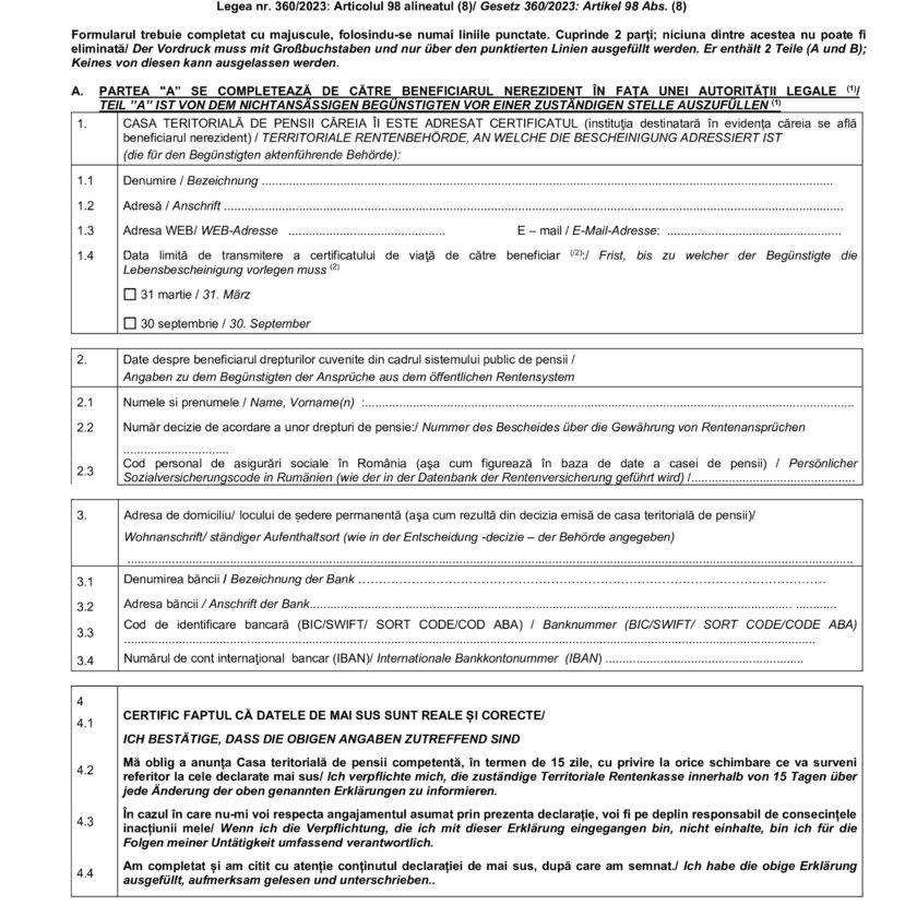 Potrivit noului cadru legal în domeniul pensiilor, în vigoare de la data de 1 septembrie 2024, Legea nr. 360/2023 privind sistemul public de pensii, în cazul beneficiarilor stabiliți în străinătate (nerezidenți), certificatul de viață se transmite semestrial, din proprie inițiativă, de beneficiarul nerezident aflat în plată, până cel târziu la data de 31 martie, respectiv până la data de 30 septembrie a fiecărui an, după cum urmează: