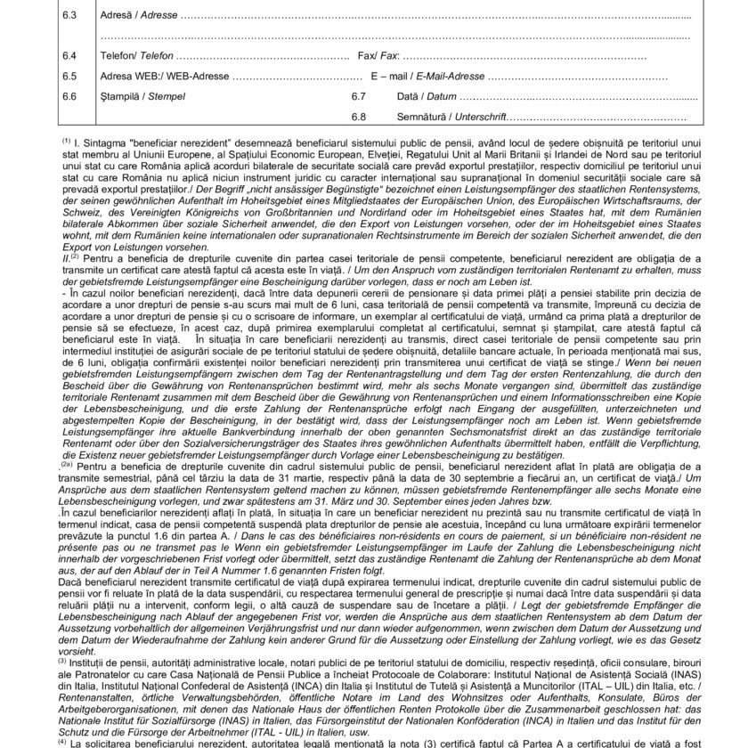Certificatul de viață trebuie semnat în fața unei autorități legale de pe teritoriul statului de domiciliu sau de ședere permanentă, după caz, respectiva autoritate certificând acest fapt.